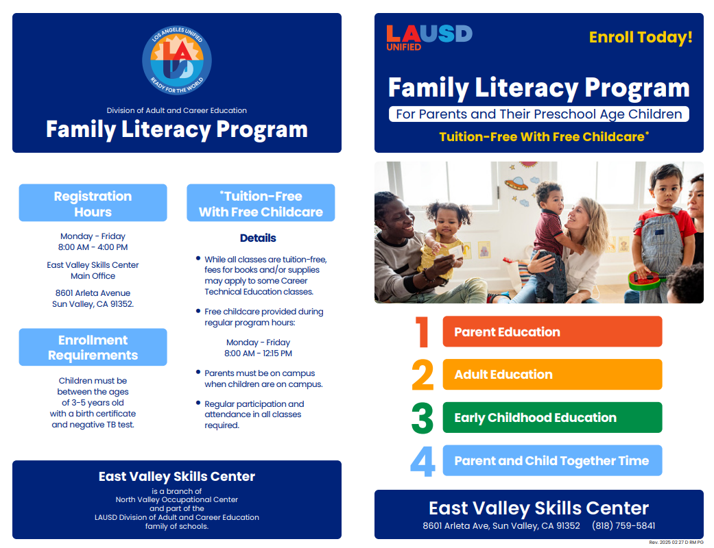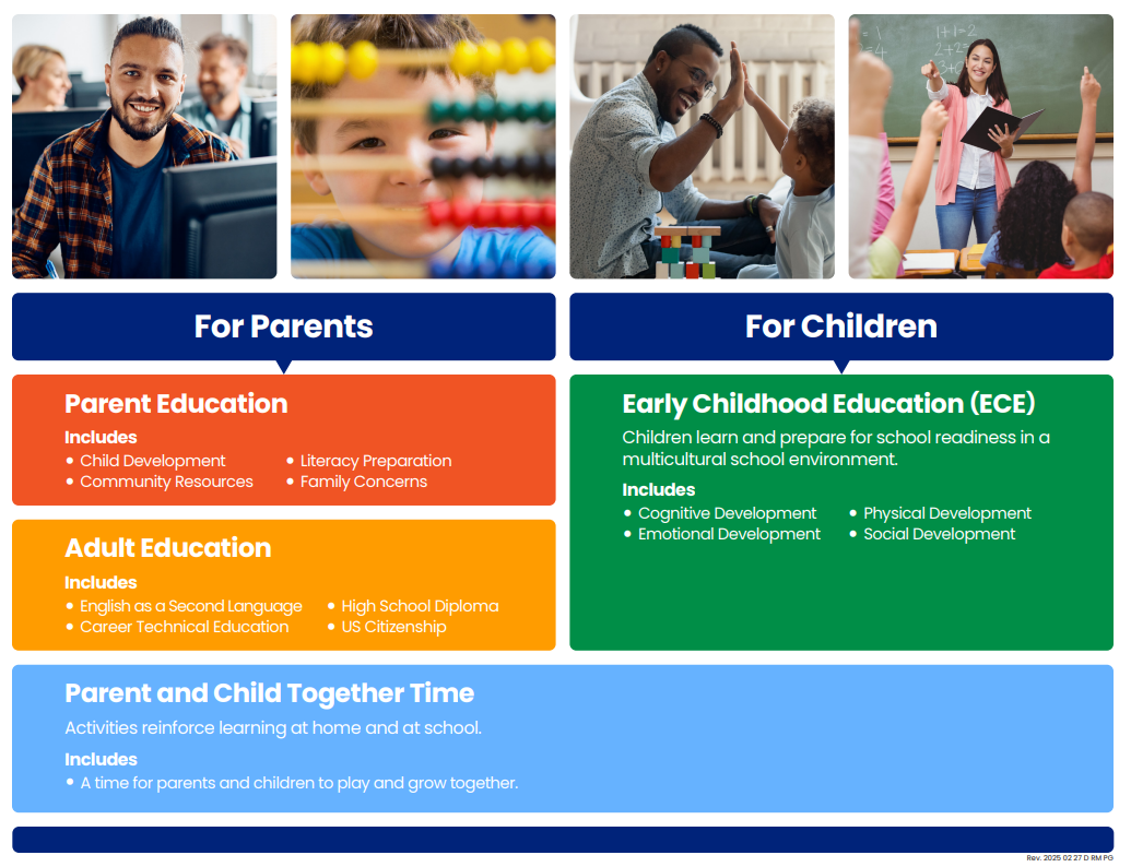 Family Literacy program is a fantastic four-component initiative designed for parents who want to continue their education while their children are learning right here on campus!