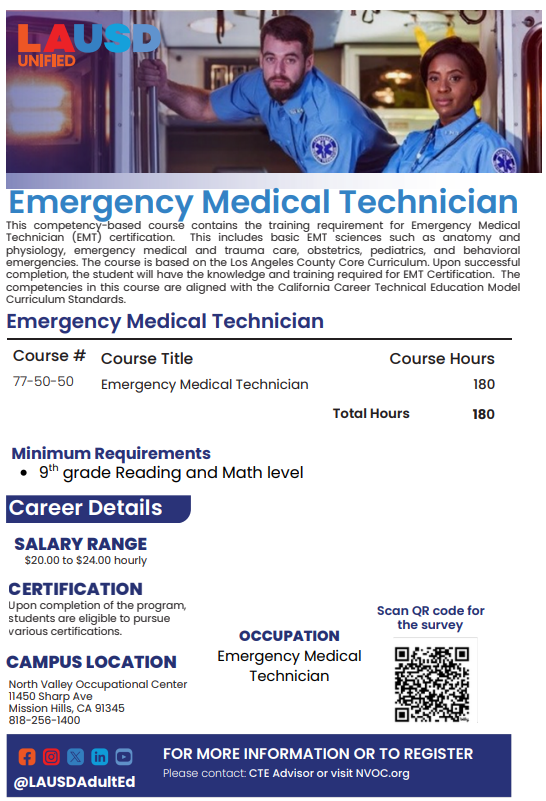 NVOC is excited to share with our community that we are planning to relaunch our EMT program for the 2026–2027 school year. While we look forward to bringing this opportunity back to our students and community, NVOC is not currently offering any EMT-related classes at this time.